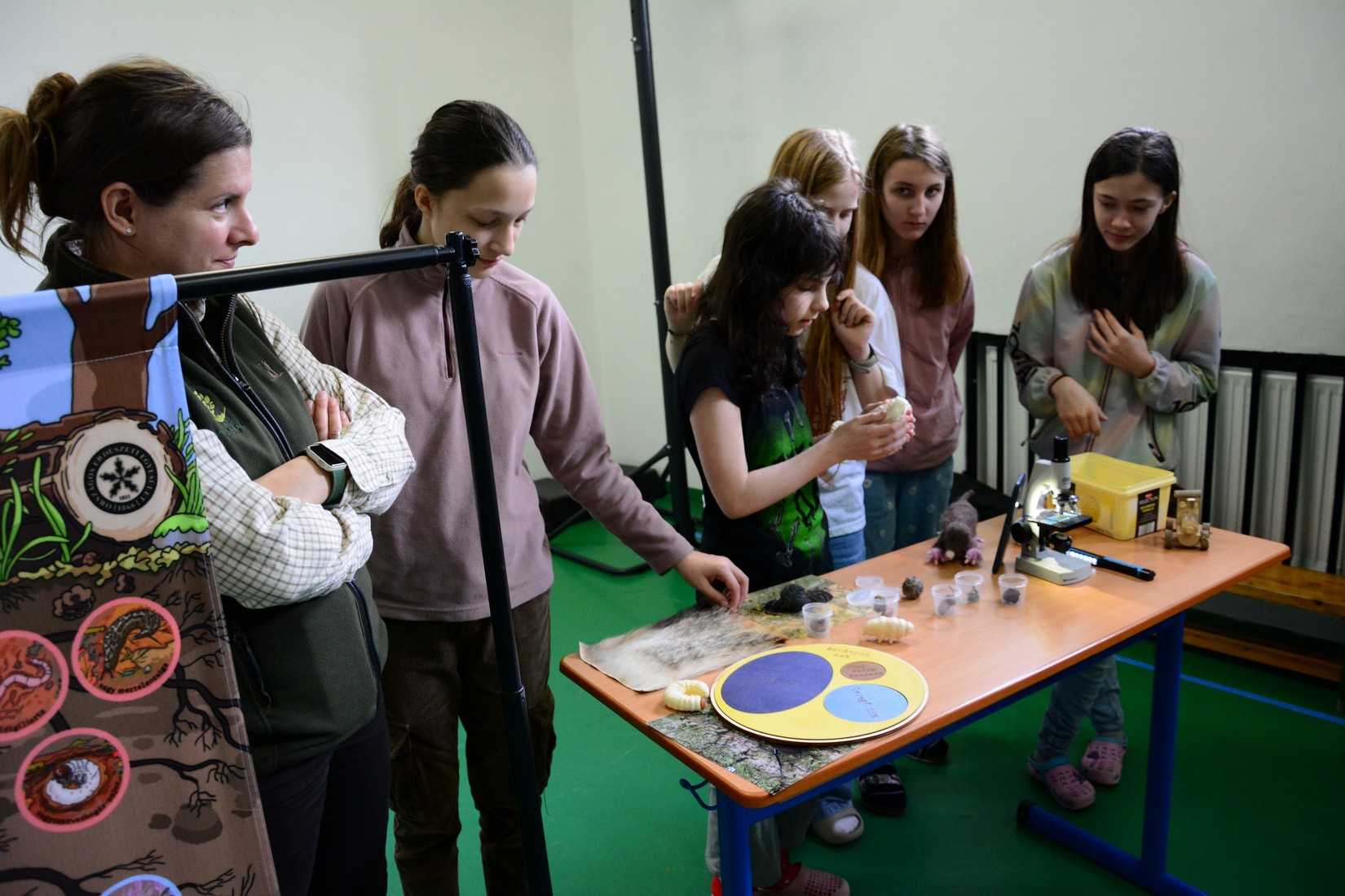 Vendégünk, Kőkuti Eszter, a Gemenci Erdő- és Vadgazdaság Zrt. Gemenci Erdészeti Erdei Iskola erdőpedagógusa Pörbölyről érkezett, hogy tudását velünk is megossza. A 2025-ös év fő témája a talaj volt: a gyerekek megismerhették a talaj összetételét, kialakulását, élővilágát, illetve a talajt veszélyeztető tényezőket is. A diákok három csoportban, a korosztályuknak megfelelő szinten mélyültek el a sokaknak ismerős, de sok újdonságot rejtő témában. Modellek segítségével megismerhették a talajban élő kisebb-nagyobb állatokat a medveállatkától a borzig, rácsodálkozhattak a róka koponyájára, preparátum formájában pedig valódi szarvasbogarat is láthattak.