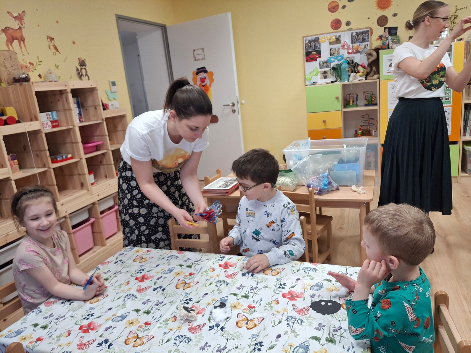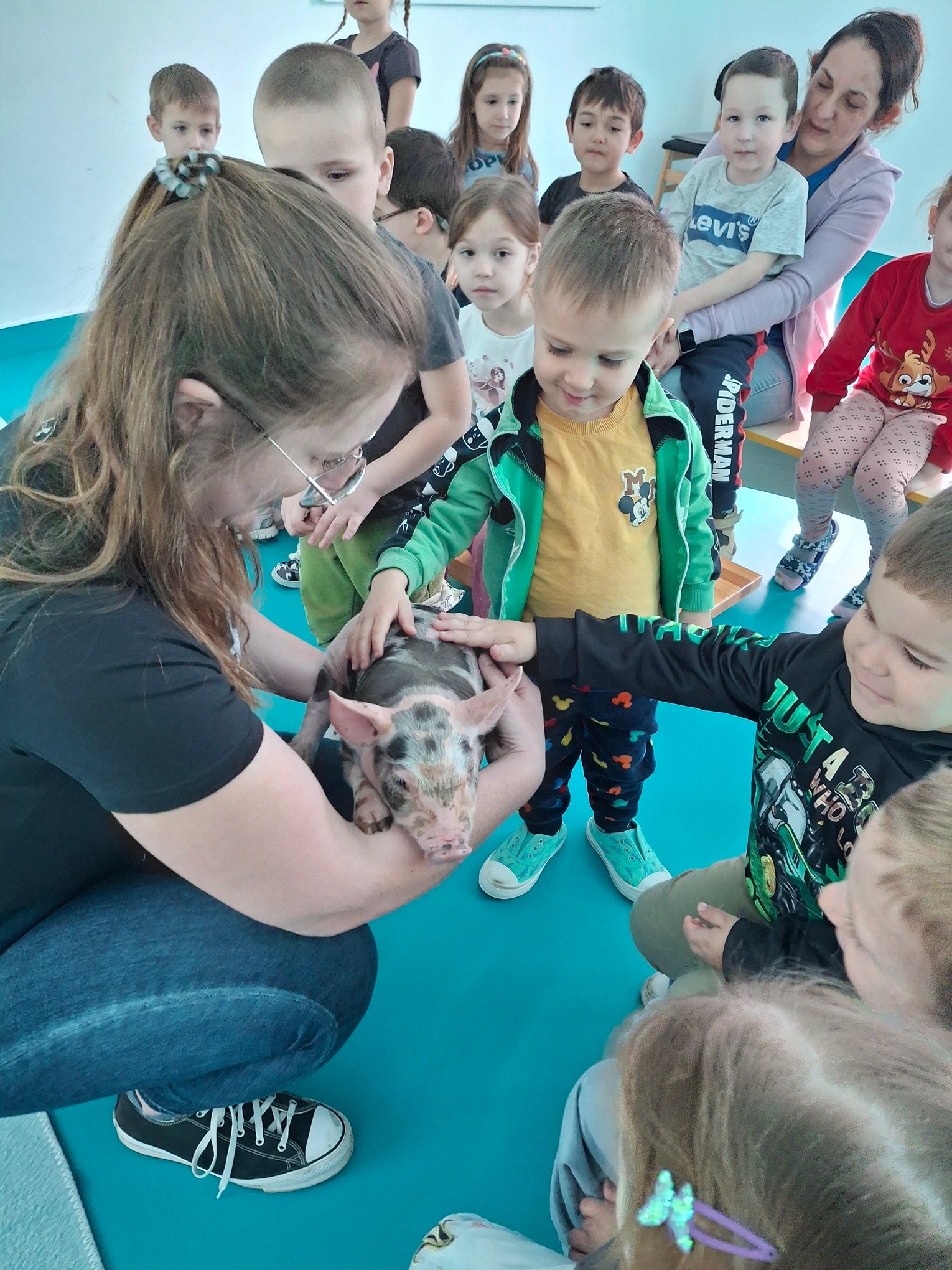 A mesterségem címere témaheteket Supliczné Toldi Kitti zárta, aki az őstermelő, állattenyésztő szakmát mutatta be a gyermekeknek. Kitti már tavaly is részt vett ezen a programon, így idén egy kicsit más módon készült a tevékenységre. Megannyi szakmai könyvet és szemléltető eszközt hozott és mutatott meg a gyermekeknek, melyeken a sertéstenyésztés ismeretei voltak láthatóak. Videókat is rögzített családjuk haszonállat nevelő tevékenységeiről és ezeket pedig be is mutatta nekünk. Beni és Isti, Kitti gyermekei is boldogan osztották meg a videókon látható információkat, cselekményeket társaikkal. Hiszen az ő életükben fontos szerepet töltenek be az állatok. A család tenyészt szarvasmarhákat, sertéseket, tyúkokat is, felelős állattartás jellemzi a munkájukat. Kitti igazi meglepetése pedig az ismertető után következett. Hozott magával egy félénk kis vendéget, akit Pötyinek neveztek. A pár hetes malacka bátran engedte, hogy megfigyeljék az óvodások a külső jegyeit. Óvatosan meg is érinthették a kis állatot, ezután természetesen szaladt mindenki kezet mosni. A malacka rendelkezik megfelelő orvosi dokumentumokkal, amiket az állattartó be is mutatott nekünk. Kitti hozott magával lucernát, szénát, szalmát, sertéseledelt, amiket meg is tudtak vizsgálni a gyermekek. Az édesanya is felhívta a figyelmet a felelős állattartás fontosságára, hiszen, anélkül nem lehetne jó minőségű élelmiszereket előállítani a haszonállatokból. Beni és Isti családjában nagyon figyelnek arra, hogy még a szarvasmarha is szeretve legyen 🙂.