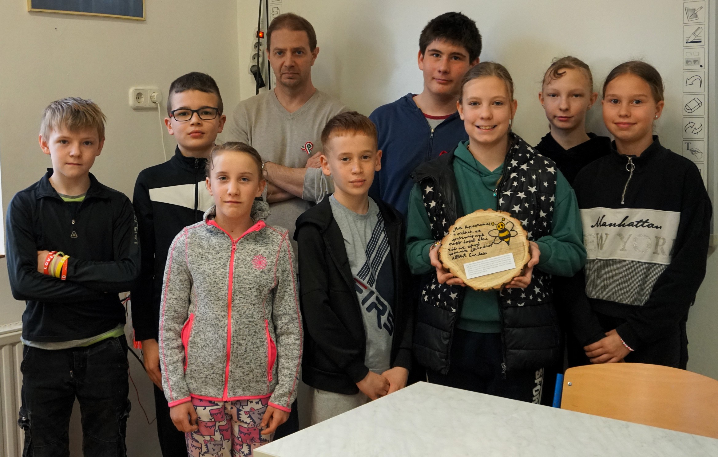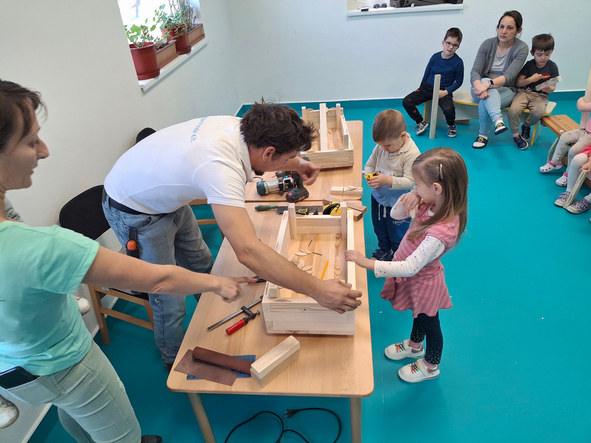 Csütörtökön a mesterségem címere témahét alkalmából a Jéga-Pordán család látogatott el hozzánk. Melinda és Norbi közösen kalauzoltak el bennünket az asztalos szakma rejtelmeibe. Martin szülei különböző eszközöket hoztak, hogy szemléltessék a szakma legjellemzőbb fortélyait. Az asztalos olyan szakember, aki faanyagokból különböző bútorokat, ajtókat, ablakokat és egyéb fa szerkezeteket készít. Az asztalos munkája magában foglalja a tervezést, a mérési feladatokat, a vágást, az illesztést, a csiszolást és a befejező munkálatokat is. Nos, az óvodás gyermekek szinte mindezeknek szemtanúi lehettek. Sőt az akkumulátoros csavarbehajtókat még ki is próbálhatták, természetesen a biztonságos munkavégzés felétételeit betartva. Norbi és Melinda interaktív előadása teljesen elkápráztatta az ovisokat. Alaposan előkészültek a nem mindennapi tevékenységre és a gyermekekkel közösen létrehoztak kettő nagyszerű virágosládát, melyet fel is ajánlottak az óvoda részére. Az előadók felhívták a gyerkőcök figyelmét a fa minden tulajdonságára. Szagoltak tapintottak különböző fadarabokat, fűrészport, faforgácsot, sőt még emlékbe is vihettek haza egy-egy kis darabkát. Norbi még egy izgalmas kísérletet is elvégzett, mellyel szemléltette a fa éghetőségét. (Természetesen felhívtuk a gyermekek figyelmét arra, hogy ezt senki nem végezheti el se otthon, se sehol máshol.) Köszönjük szépen Melindának és Norbinak ezt az igazán különleges délelőttöt!