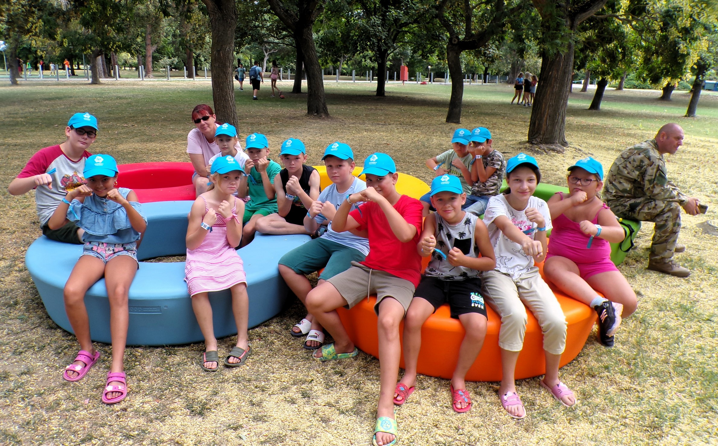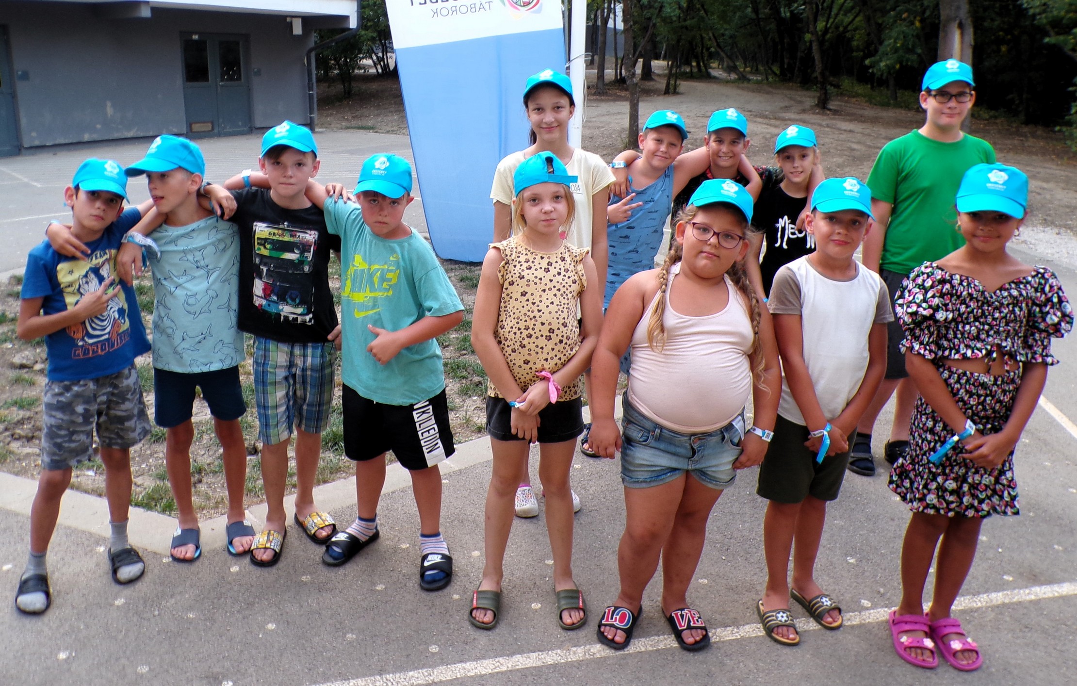 A mai nap az utazásról, illetve a tábor megnyitásáról szólt. Székesfehérvárig mindenki egyénileg megoldotta az utazást (ezúton is köszönjük a szülők közreműködését és Toldi-Bodai Blankáéknak a csomagok szállítását), majd onnét különvonattal jöttünk tovább Zánkafürdőre számos más táborozó csapattal. A bejelentkezésnél örömmel láttuk (legalábbis e sorok írója biztosan 😁) hogy a világoskékek altáborába kerültünk, így tanulóink ebben a színben kapták meg ajándék sapkáikat, amely a csapathoz való tartozást jelképezte. Finom ebéddel (burgonyapüré fasírtgolyócskákkal, savanyú uborka) fogadtak bennünket a szervezők, uzsonnára pedig mogyorókrémes gofrit és körtét kaptunk. A délután folyamán elfoglaltuk szállásunkat, Bea tanárnénitől pedig megtanulhatta mindenki az ágyneműhúzás fortélyait, gyakorlati bemutatóval egybekötve. Vacsorára hot-dogot és muffint kaptunk, majd hivatalosan is megkezdődött az élménytábor. Az altábornyitó ceremónián megismertük a tábor házirendjének legfontosabb szabályait, felköszöntöttük egy kis énekkel az egyik születésnapos tábortársunkat, megtanultuk a világoskékek indulóját és felvontuk a tábori zászlót.