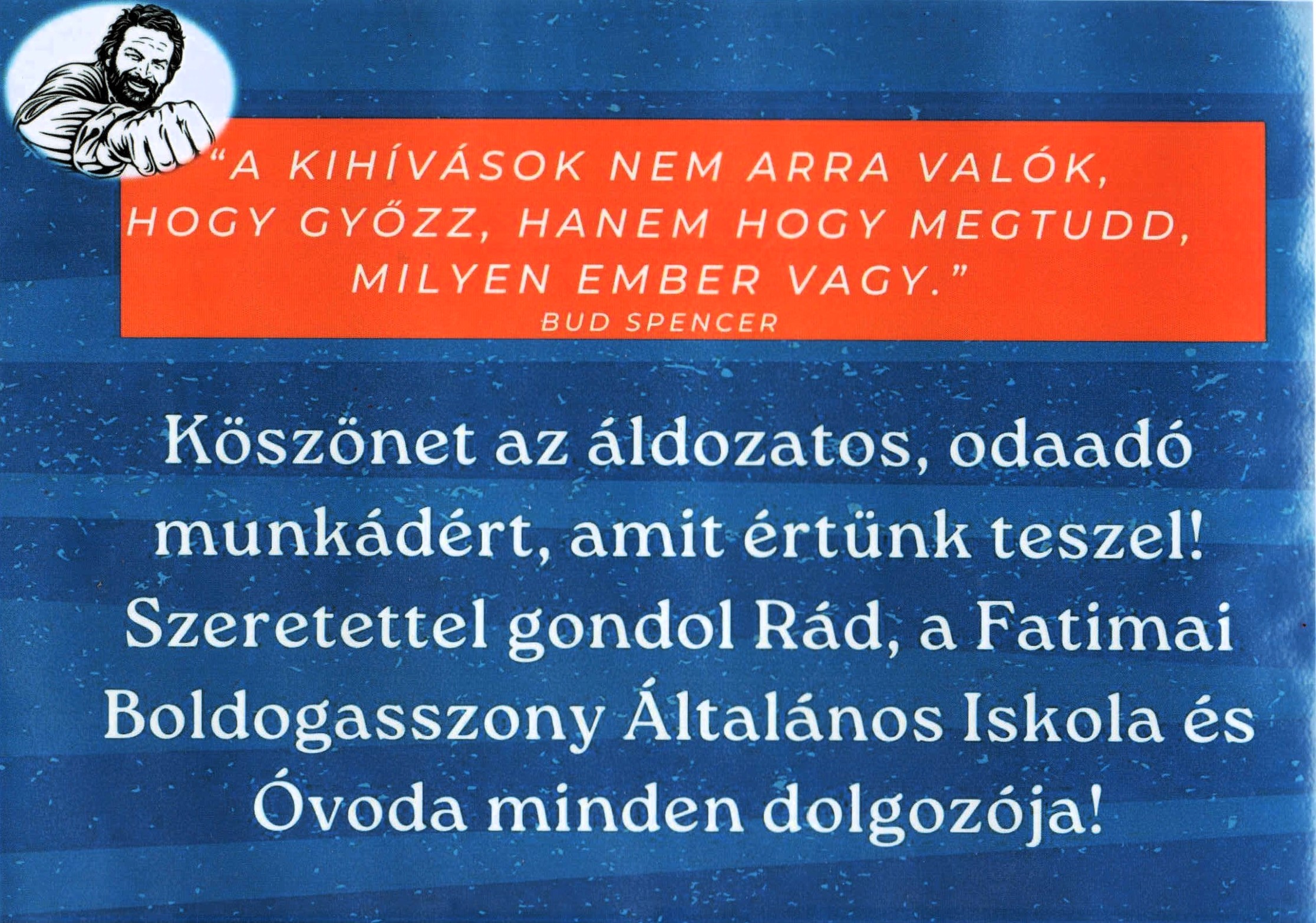 Mit is mondhatnék erre, kedves kollégák és munkatársak? Természetesen nagyon jólesett a meglepetés. Bevallom, nem számítottam rá, hiszen nekem természetes, hogy ezért az intézményért, közösségért próbáljak meg tenni immár 27 éve. Köszönetképpen néhány rövid és egy hosszabb idézetet szeretnék veletek megosztani, amelyek alapján próbálom végezni munkámat évek óta. Kívánom, hogy számotokra is adjanak erőt, kitartást, útmutatást ezek a nehezebb időszakokban is.