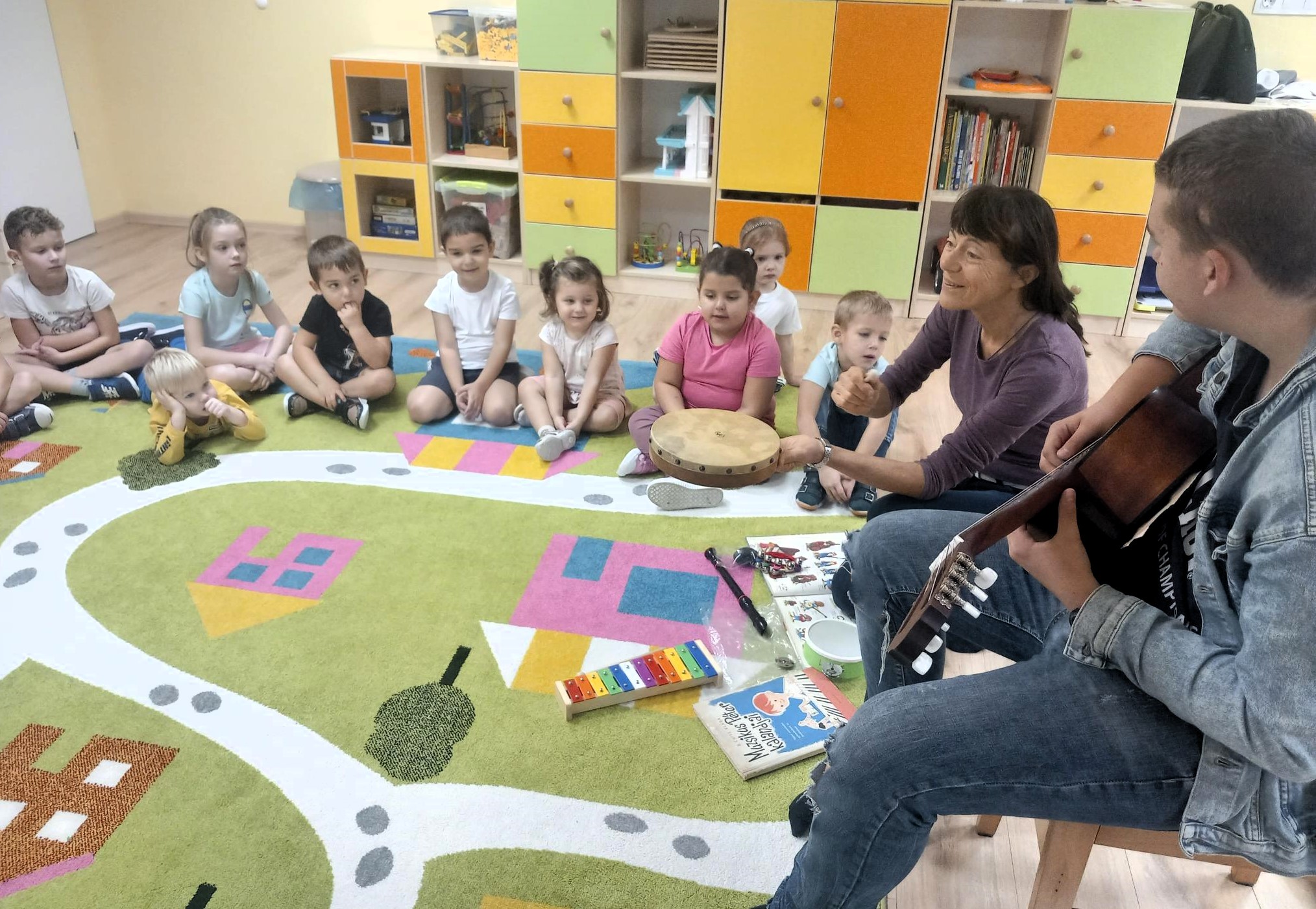 A mai napon, testnevelés foglalkozásunk után, különleges vendégek érkeztek hozzánk a Fatimai Boldogasszony Általános Iskolából. Aranyos Judit tanár néni és Marosvári Máté, az iskola hetedik osztályos növendéke, bemutattak pár általuk ismert és használt hangszert. Judit néni furulyát, xilofont, dobot, hangtálat és még sok érdekes hangszert szólaltatott meg. Könyvekkel, különböző szemléltető anyagokkal készült a mai alkalomra. Elmesélte, hogy régebben ő tanította a furulya tantárgyat a leendő óvó néniknek. Jelenleg az iskolában matematikát tanít felsős tanulóknak, mindamellett, hogy már nyugdíjba vonult.