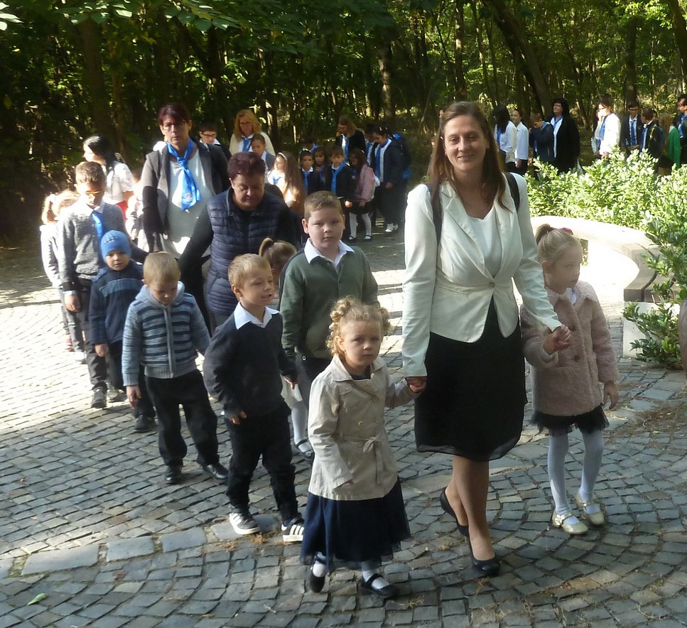Az autóbuszról leszállva először kívülről megcsodáltuk a Kisboldogasszony római katolikus plébániatemplomot. Elég szeles időnk volt ezért, hogy egy kicsit felmelegedjünk felelevenítettünk néhány Jézusról, templomról, harangokról szóló mozgásos dalocskát is. Második állomásunk az előszállási általános iskola előtt található játszótér volt. Itt minden gyermek kipróbálhatta a felújított játékparkot. Igen szép környezetben találhatóak ezek a játékok, amit az őszi táj még jobban szebbé varázsolt. Ezen a helyen nassolhattak, játszhattak, hintázhattak, csúszdázhattak, futkározhattak a gyermekek.