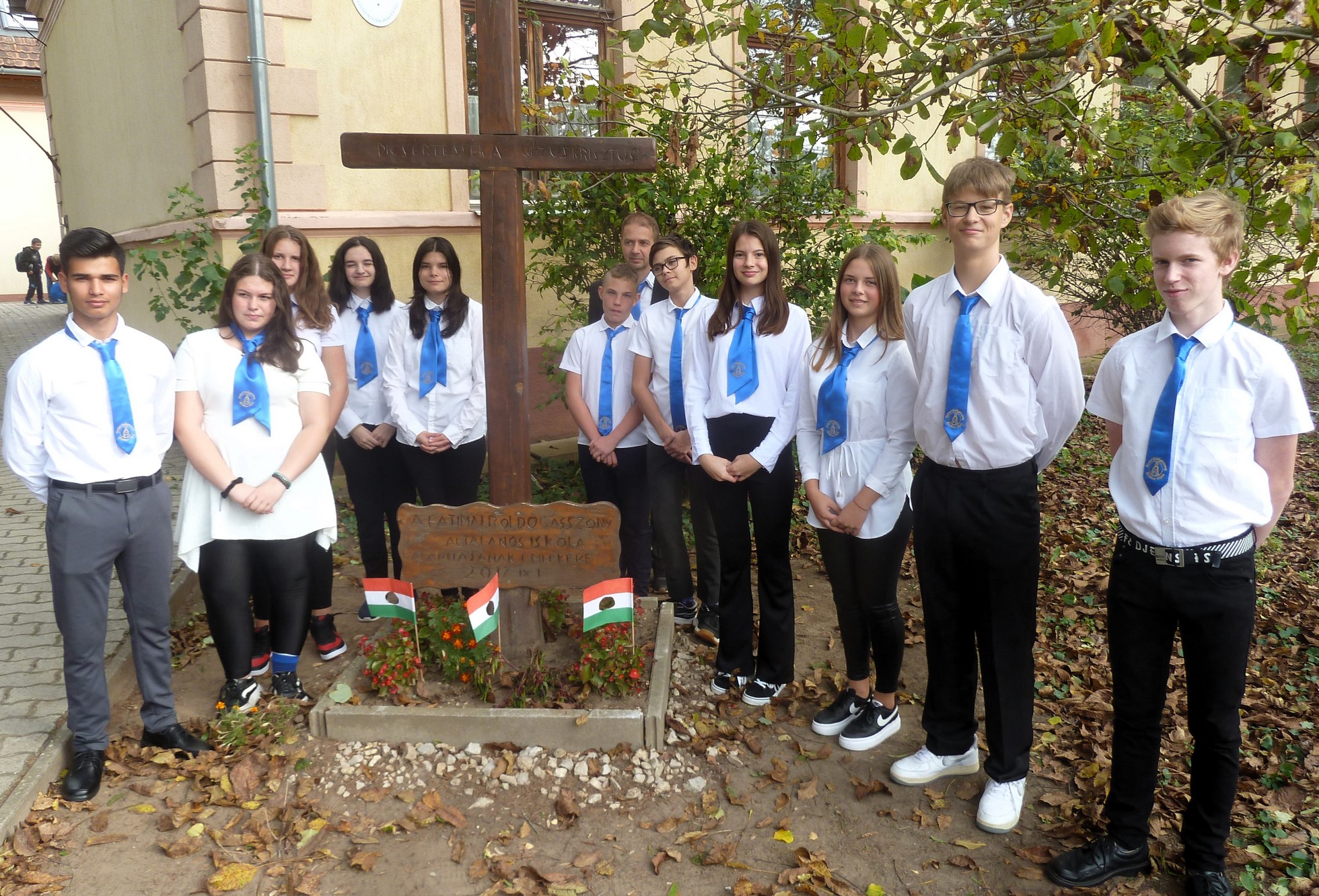 Megemlékezésünk a Polgármesteri Hivatalnál kezdődött, ahol a települési önkormányzat nevében Husvéth Imre polgármester úr, a Fatimai Boldogasszony Általános Iskola és Óvoda képviseletében Kiss Attila intézményvezető úr koszorúzás keretében főhajtással tisztelegtek a hősök emlékművénél, a 8. osztályos zászlótartók kíséretében. Óvodásaink pedig Turzainé Gazsó Kata óvónő vezetésével 1956-os zászlókat tűztek ki a virágok mellé.
