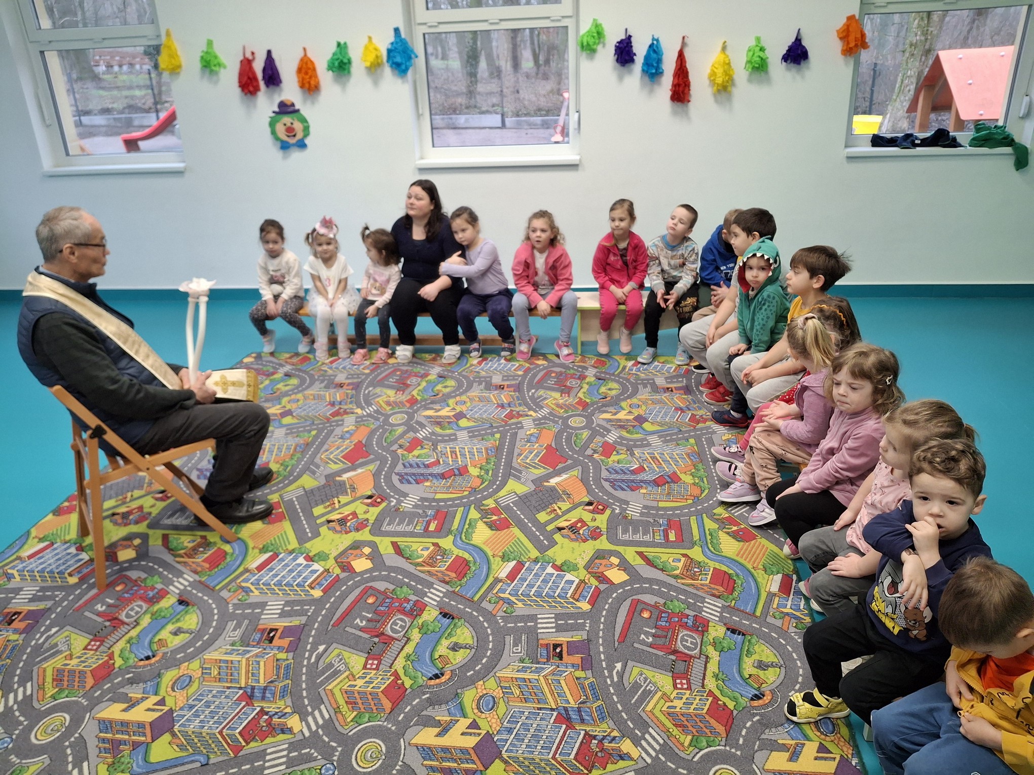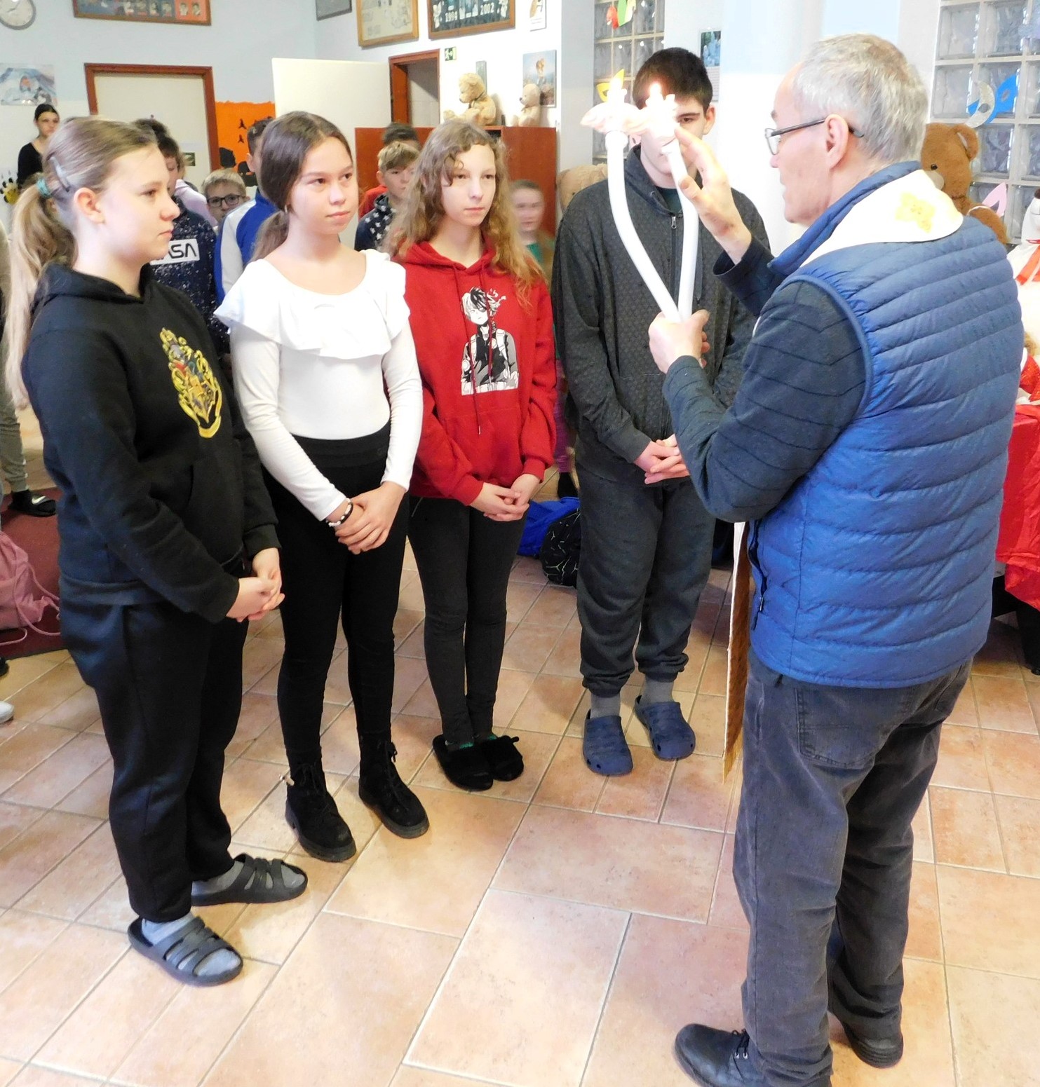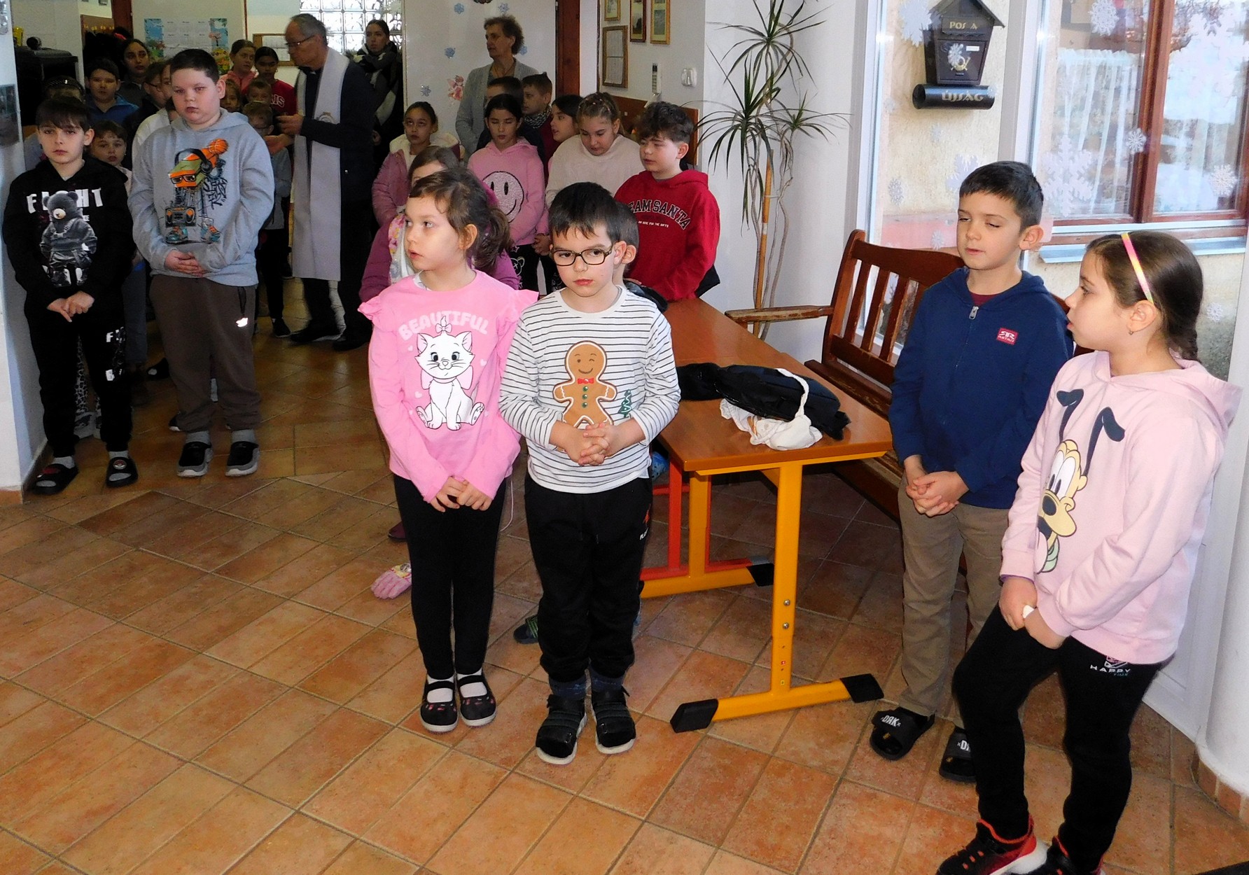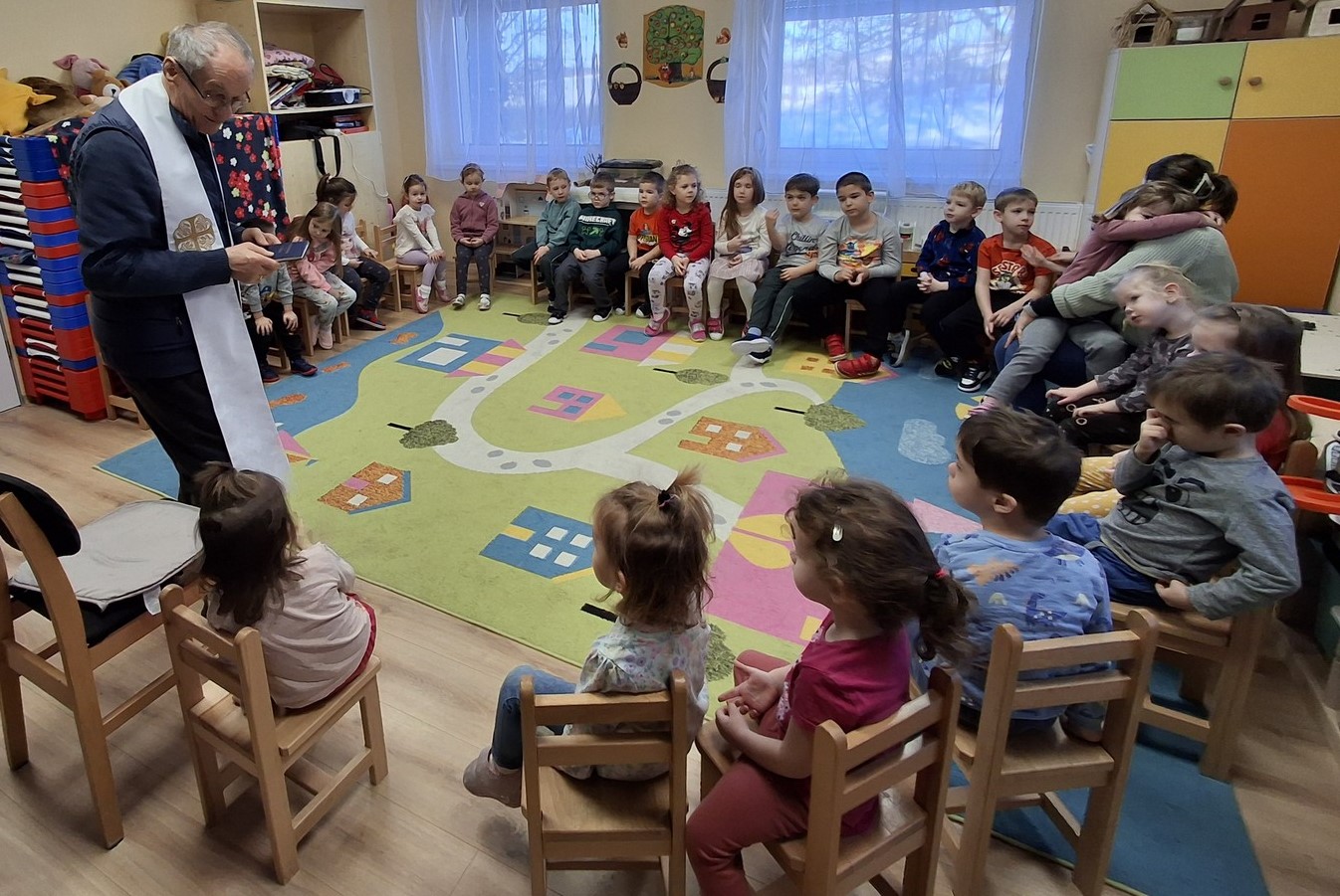 Január 12-én Helter István atya, intézményünk püspöki biztosa látogatott el hozzánk. István atya azért érkezett, hogy áldásban részesítse óvodánkat és a benne lévőket. A házszentelés (vagy házáldás) a keresztény hagyományban, leggyakrabban vízkereszt (január 6.) táján végzett szertartás, melynek során a pap szenteltvízzel meghinti a lakást, és felírja az évszámot és a „C+M+B” betűket (Christus Mansionem Benedicat - Krisztus áldja meg e hajlékot) az ajtóra, áldást és védelmet kérve a benne lakókra. Köszönjük István atyának a közös imádság és beszélgetés élményét.