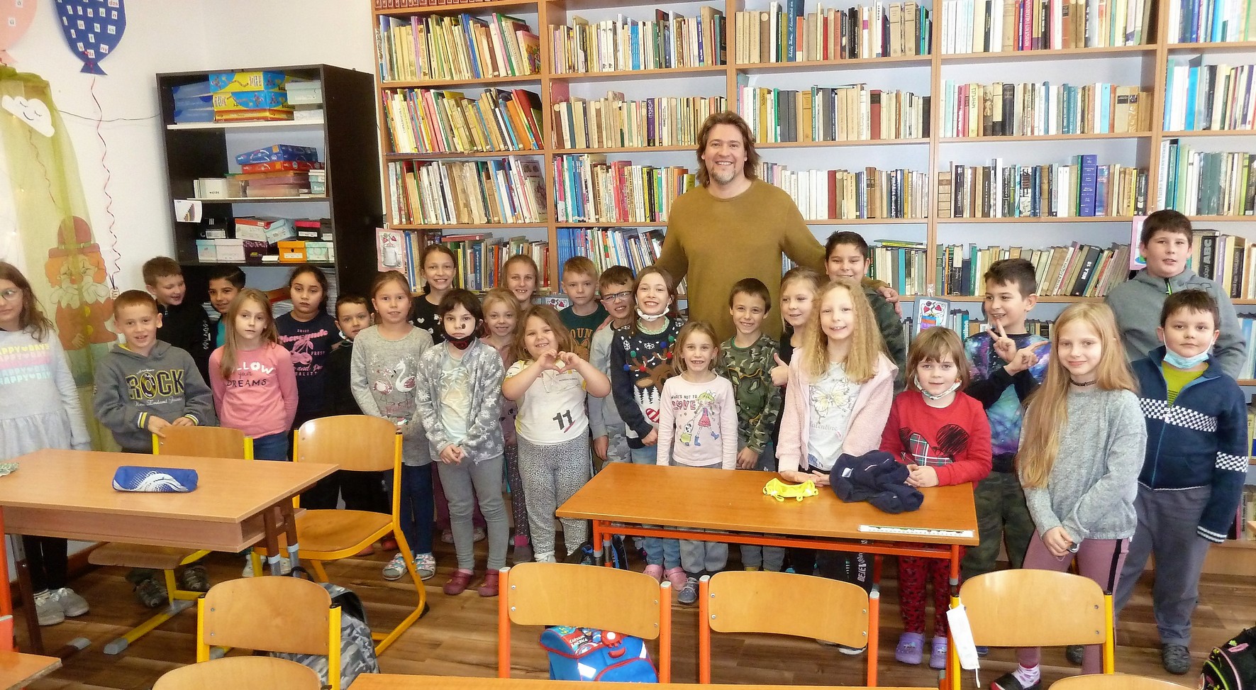 Takács Sára könyvtáros meghívásának köszönhetően az alsó tagozatosoknak Böde Péter meseíró tartott élvezetes foglalkozást iskolánk könyvtártermében.