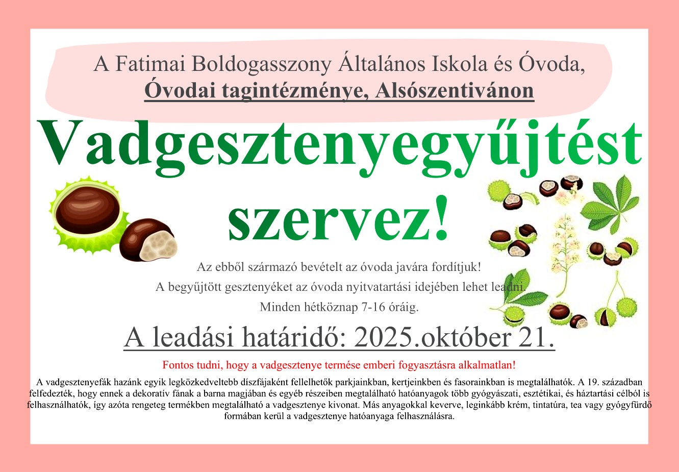 Szeretnénk vadgesztenyegyűjtést is szervezni, az ebből származó bevételt természetesen az óvoda javára fordítjuk.