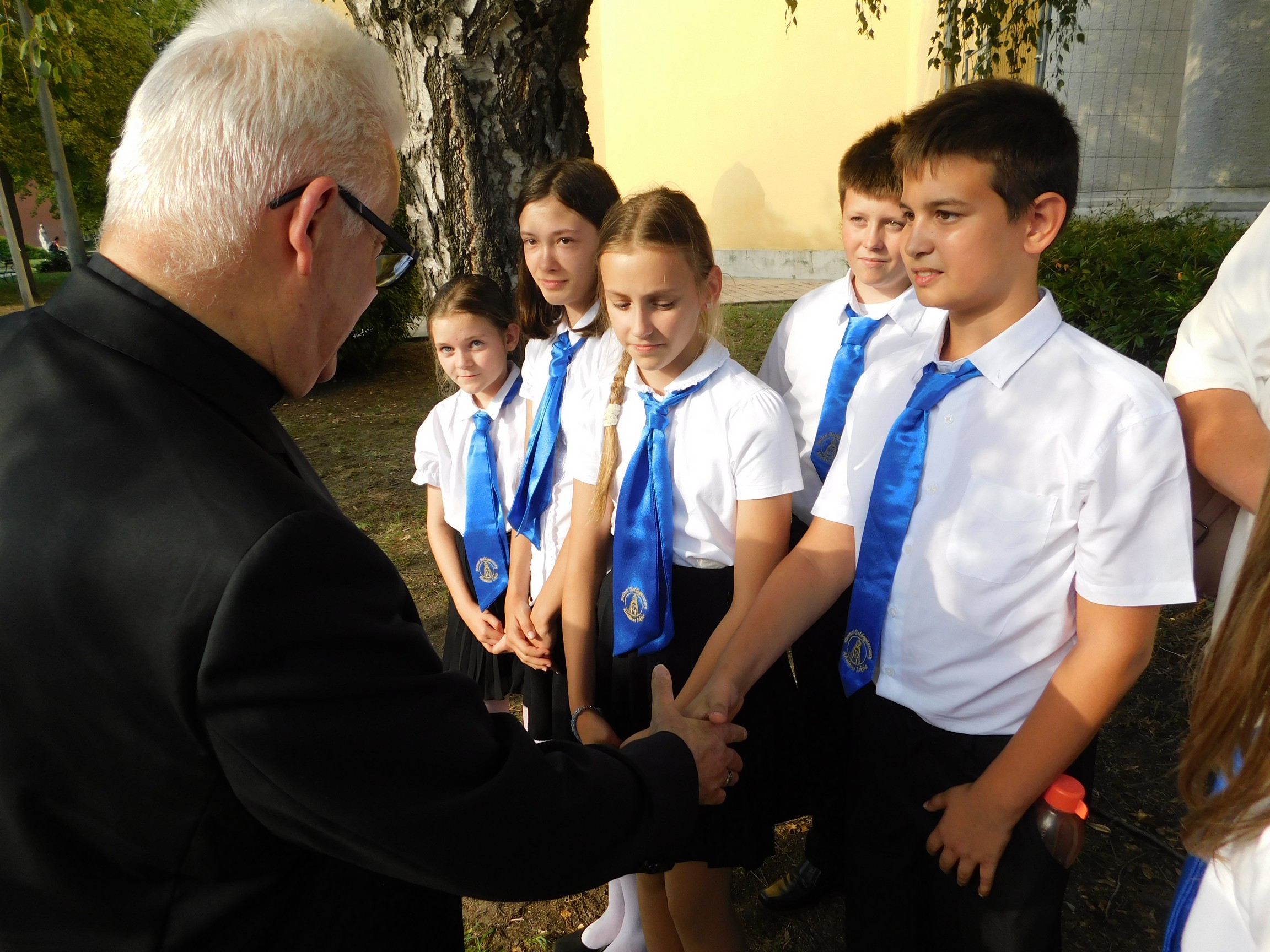 A szentmise után Püspök Atyával is volt alkalmunk személyesen találkozni, aki sikeres, eredményes, örömben megélt új tanévet kívánt számunkra, köszönetét küldve a többi diáknak és pedagógusnak, dolgozónak is. A főpásztor kérte a gyerekektől, hogy legyenek jók, tegyenek jót környezetükben is minél többször, s diákjaink megígérték, hogy a tanulás mellett ezt sem fogják elhanyagolni. Úgy legyen!