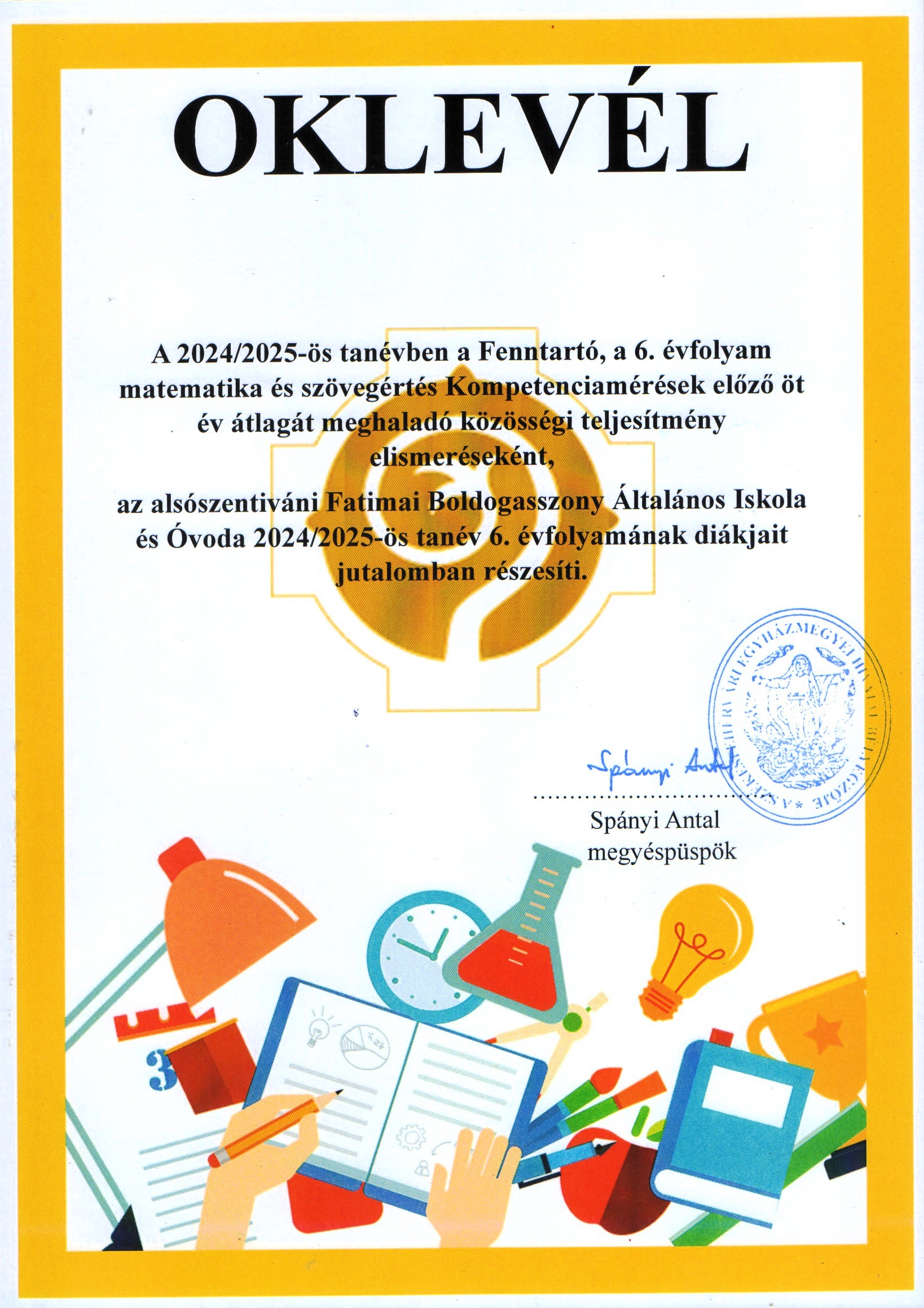 A záró áldás előtt a kompetenciamérések során legjobb eredményt elérő diákok oklevelet vehettek át a főpásztortól. Örömmel adunk róla hírt, hogy idén a tavalyi 6. osztályosaink (jelenlegi 7. évfolyamosaink) tavaszi teljesítményét is jutalmazza a fenntartónk, az erről szóló oklevelet az osztály képviseletében Bacsa Tímea vehette át. Eredményükhöz gratulálunk, jövő tavasszal ismét érdemes lesz koncentrálni a felméréseken!
