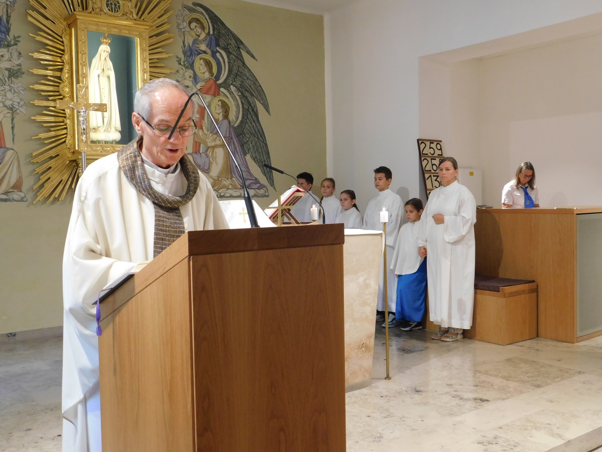 Prédikációjában a sokak által csak Gyuri atyának nevezett lelkész a fatimai látnokok példáját felidézve elmondta, hogy a gyermekektől 1917. szeptember 13-án azt kérte a Szűzanya: Imádkozzátok tovább a rózsafüzért, hogy így siettessétek a háború végét! Ez az üzenet ma is aktuális. A világ békéje a Szűzanya kezében van, de ezt ki kell imádkozni. Máriától is kérhetjük a békét, a rózsafüzér rendszeres imádkozásával. Az elhangzott napi evangéliumból kiindulva – „Istennél semmi sem lehetetlen!” utalt arra a lelkipásztor, hogy a viharos történelmi időkben mindig jött az imákra valamilyen váratlan segítség, akkor is, amikor földi emberként lehetetlennek tűnt a helyzet, mint pl. Hirosima és Nagaszaki bombázásánál vagy a szovjet kommunista diktatúra legkegyetlenebb korszakában.